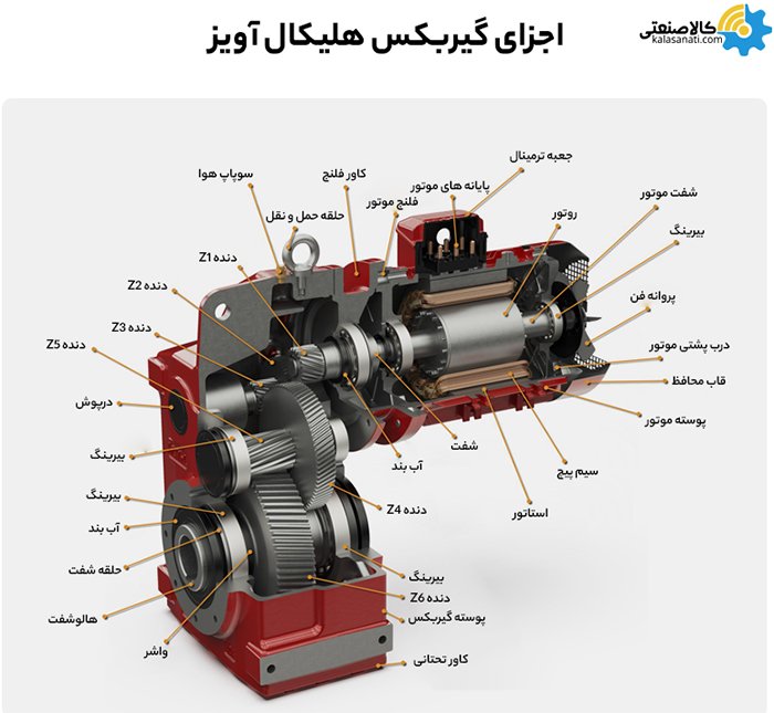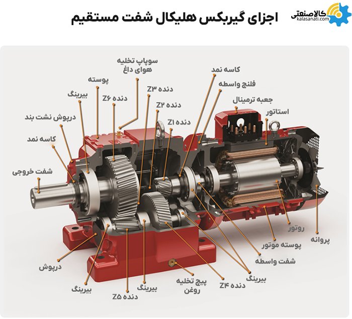 - 2 الی 3 جفت دنده هلیکال (مارپیچ) که به شفتهای ورودی و خروجی متصل شده اند.
