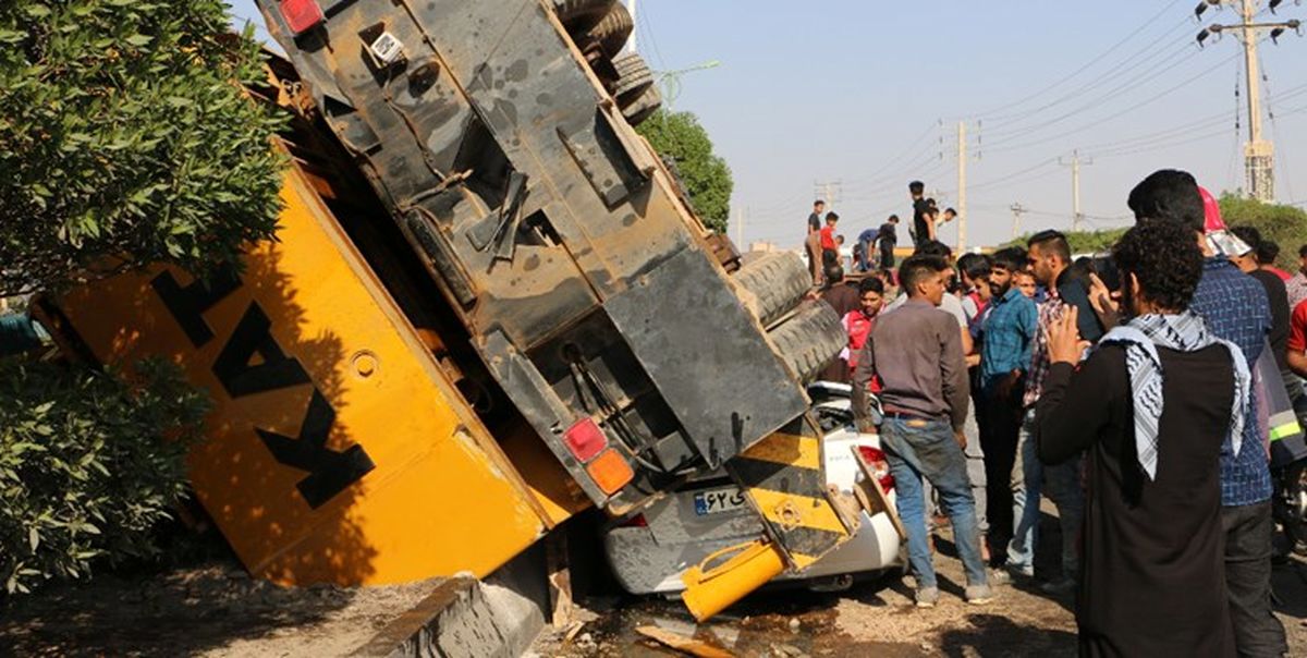 تصویری هولناک از واژگونی جرثقیل در اهواز/ خودرو تیبا پرس شد +عکس